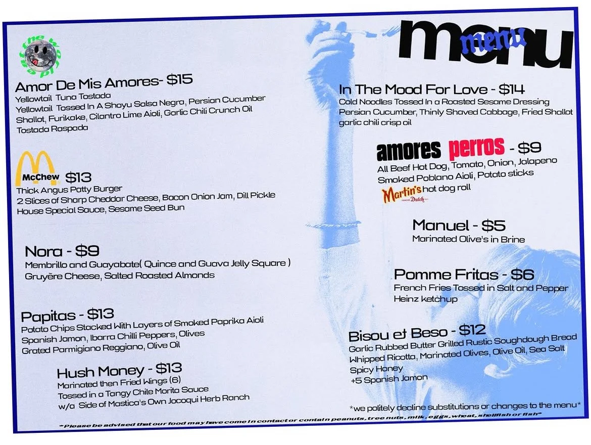 Sample menu. Subject to change with what’s available. WE WELCOME OUR NEW RESIDENT CHEF: MASTICASERVING DINNER EVERYDAY WED-SUN Resident Chef: MASTICA